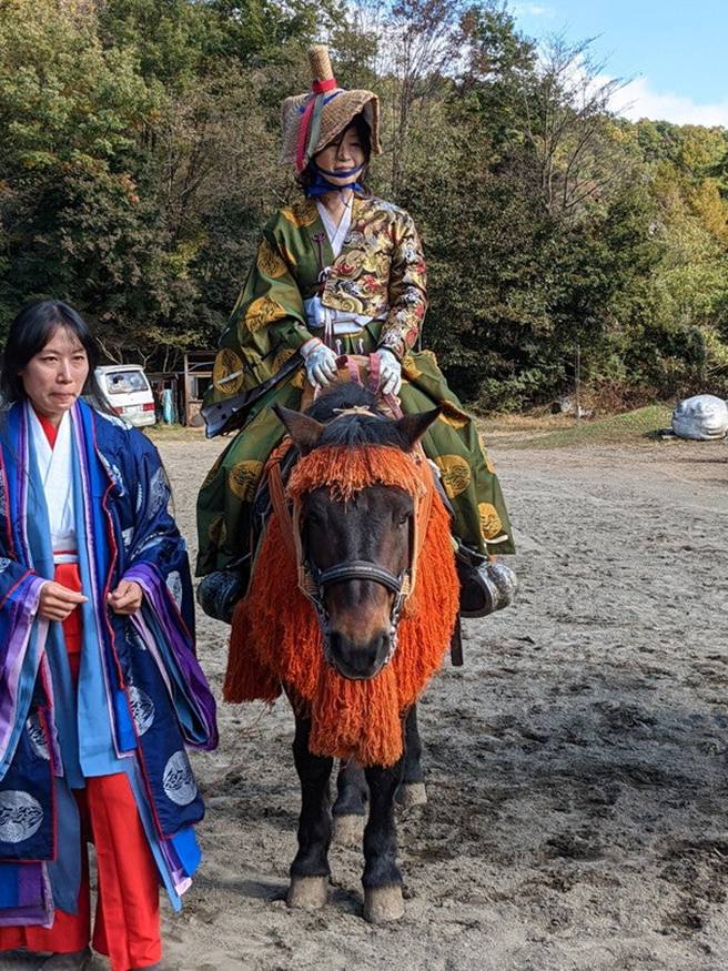 A demonstration spanning the Heian to Kamakura periods began, accompanied by the sound of a shinobue flute played by a court lady wearing a single-layered robe (hitoe), mounted on a native horse.