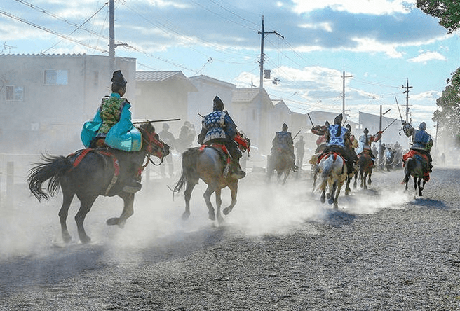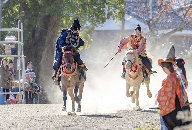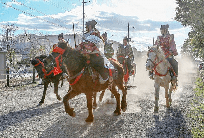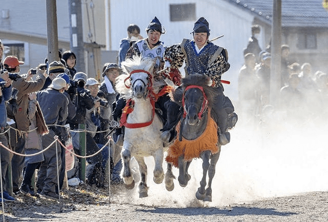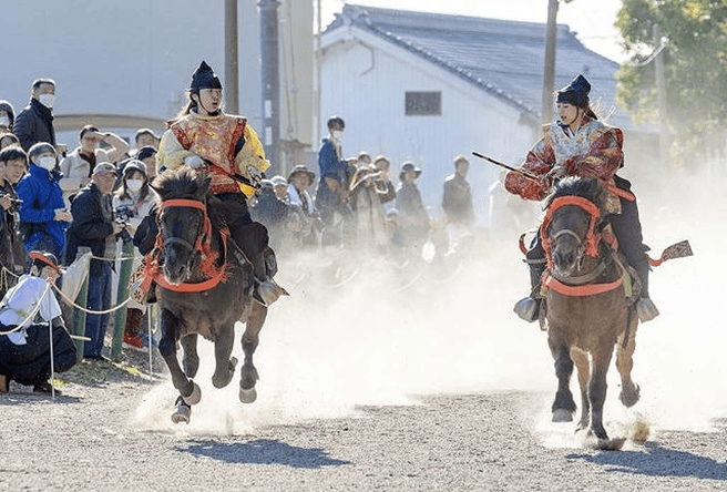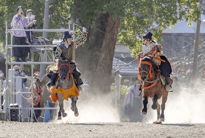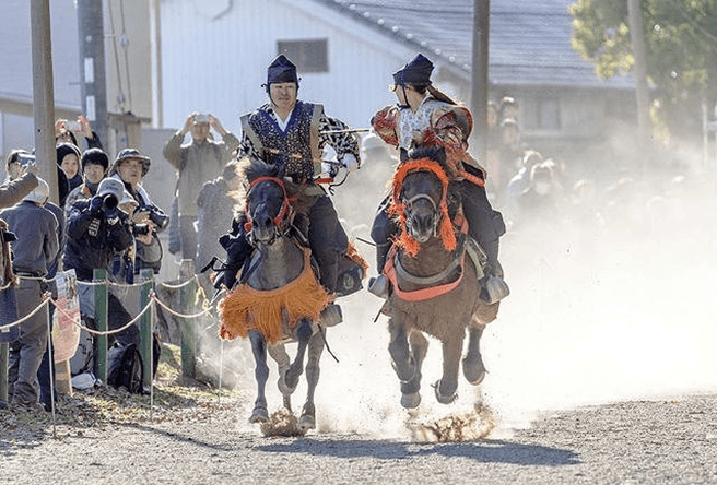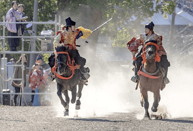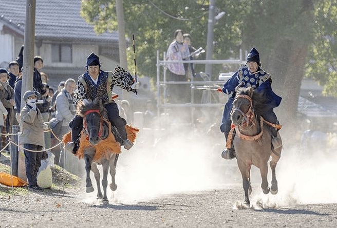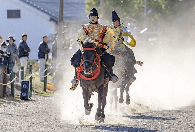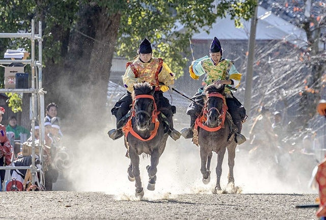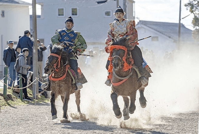 Facing the goal 170 meters ahead, the left side is called Sahō and carries a scarlet tasseled whip. The right side is Uhō and carries a purple tasseled whip. The start signal is given by two beats of a drum. Both riders shout “Oh! Oh! Oh!” three times and, making eye contact, begin the race. The rider who crosses the finish line first is the winner.