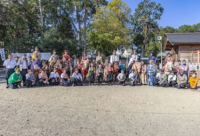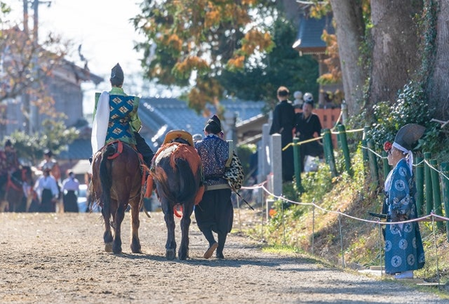 The Kurabe-uma we perform at Mikarino-no-Mori Kamo Shrine is based on the above-mentioned ancient racing tradition. Drawing on publications by the Horse Museum and other sources, we have arranged the movements to eliminate unnecessary gestures, and the event is offered annually at this shrine in accordance with the regulations of the Japan Kurabe-uma Competition Association (Chairman: Yukio Kikuchi, Representative of Koyodai Kiso Horse Ranch).